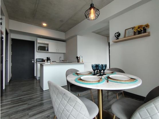 Disfrute de un estilo de vida moderno en este elegante apartamento de 2 habitaciones y 2 baños, ubicado en un nivel alto que ofrece impresionantes vistas a la ciudad y las montañas. La propiedad cuenta con una distribución funcional y contemporánea. Su área social integra sala, comedor y cocina en un concepto abierto, con excelente iluminación natural gracias a sus ventanales de piso a cielo. La cocina presenta un diseño limpio y moderno, con sobres amplios y barra desayunador ideal para compartir. El apartamento dispone de: Habitación principal con baño privado y acceso a balcón Habitación secundaria con excelente iluminación natural Segundo baño completo para visitas o uso compartido Dos balcones que permiten disfrutar de ventilación cruzada y vistas privilegiadas Área de sala acogedora con salida directa a uno de los balcones 1 espacio de parqueo Acabados contemporáneos como pisos tipo madera, cielos de concreto expuesto y detalles decorativos que aportan carácter y estilo. Se vende sin amoblar, con opción de negociación del mobiliario existente. Ideal para quienes buscan vivir en un espacio moderno, con vistas únicas y excelente aprovechamiento del espacio, o como inversión para alquiler.