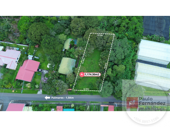 Se ofrece en venta un lote de 1,174.30 m², con una ubicación estratégica en la comunidad de Esquipulas de Palmares, a tan solo 1.5 km del centro de Palmares y 3 km de San Miguel de Naranjo.